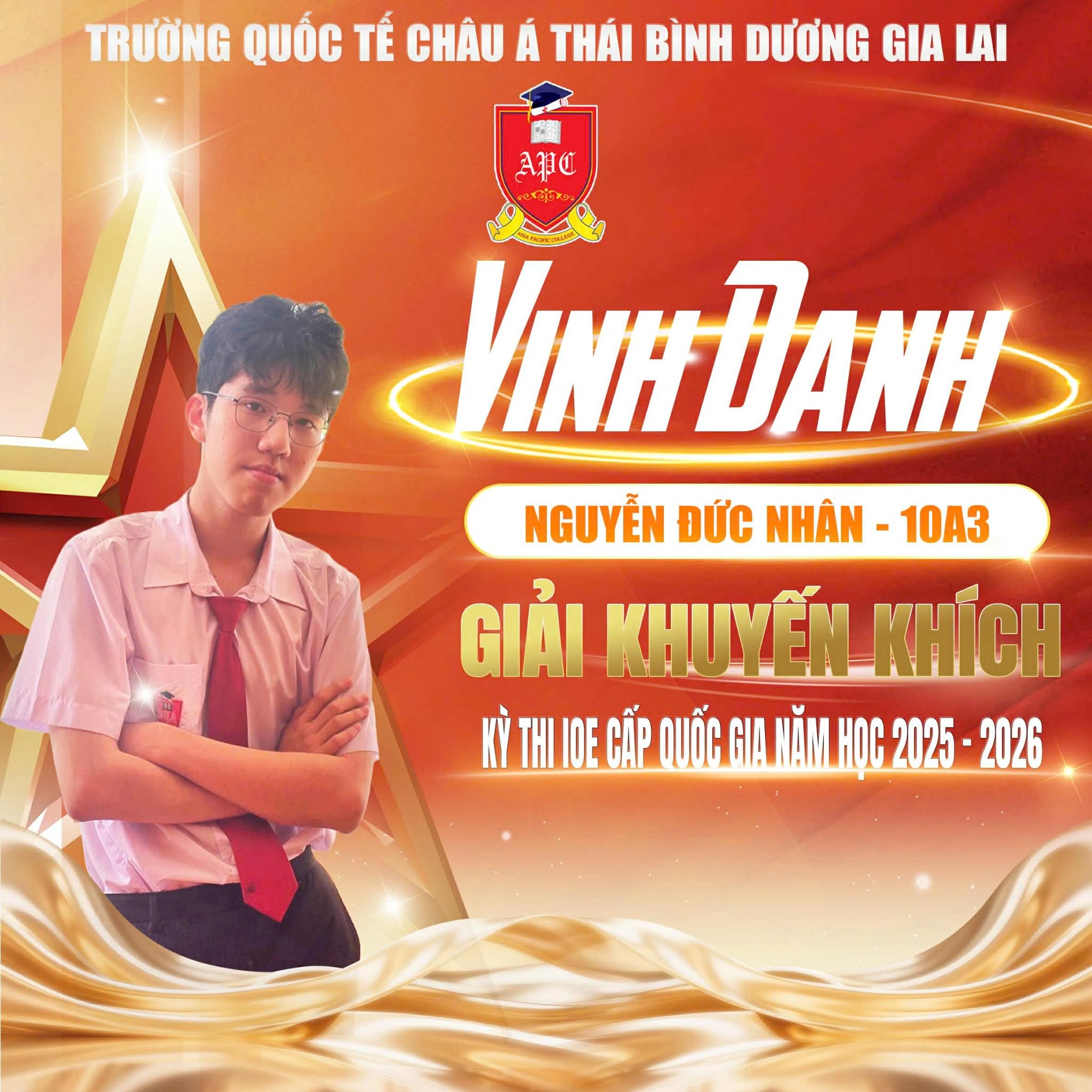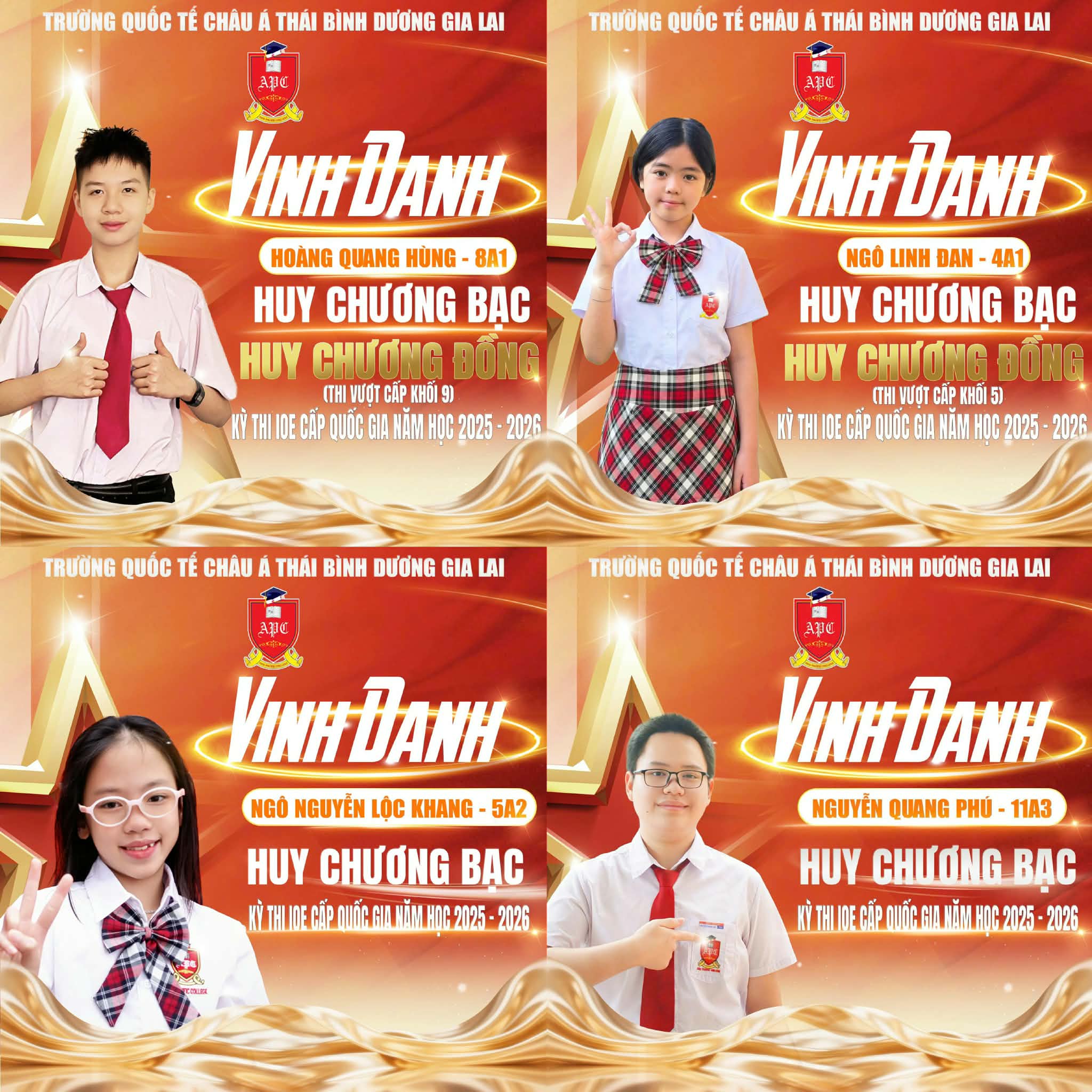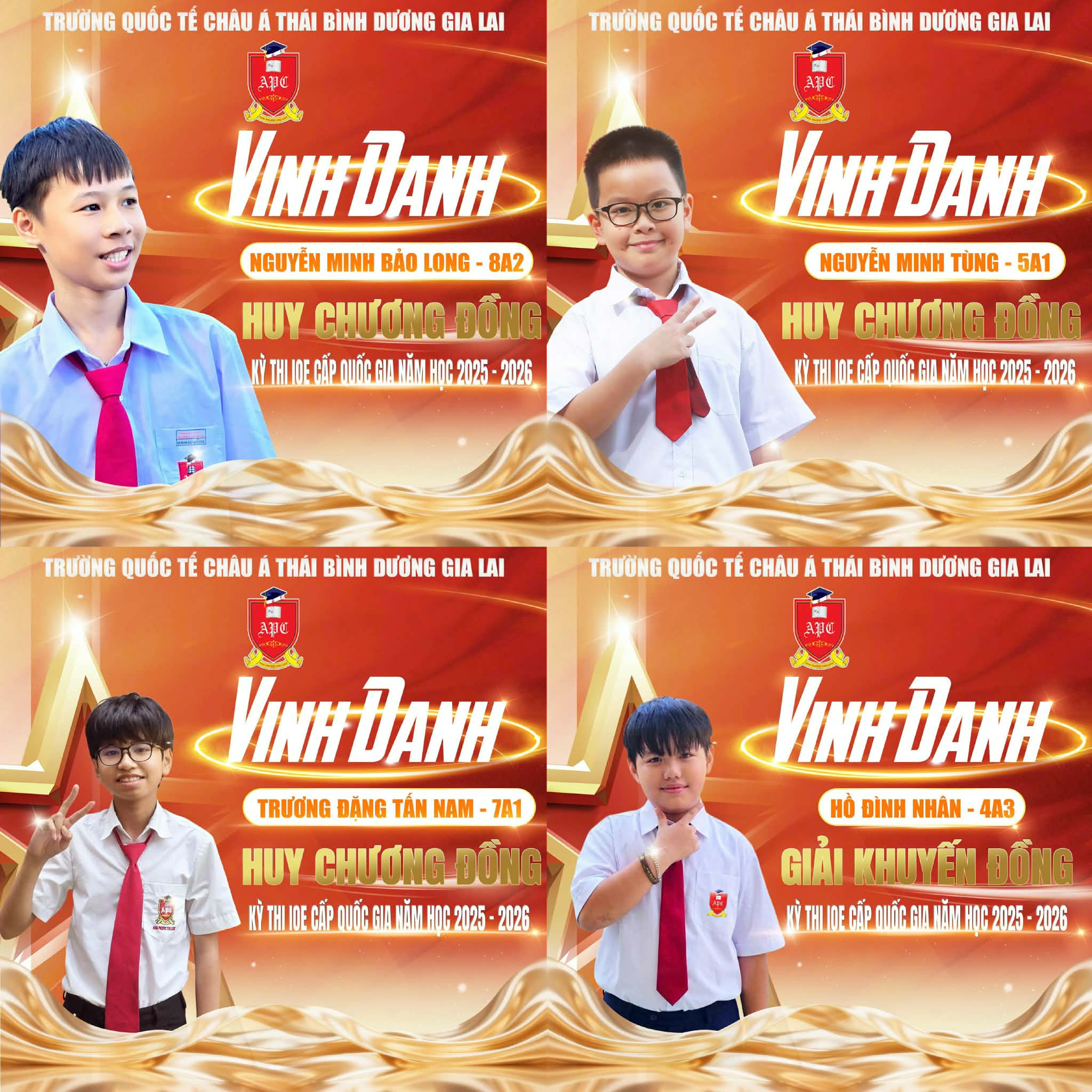 Đội tuyển học sinh Trường APC đã xuất sắc giành tổng cộng 17 giải thưởng tại Kỳ thi Olympic Tiếng Anh trên Internet (IOE) cấp Quốc gia, trong đó có 1 Huy chương Vàng, 4 Huy chương Bạc, 6 Huy chương Đồng và 6 giải Khuyến khích, khẳng định năng lực ngoại ngữ vượt trội và bản lĩnh thi đấu ấn tượng.